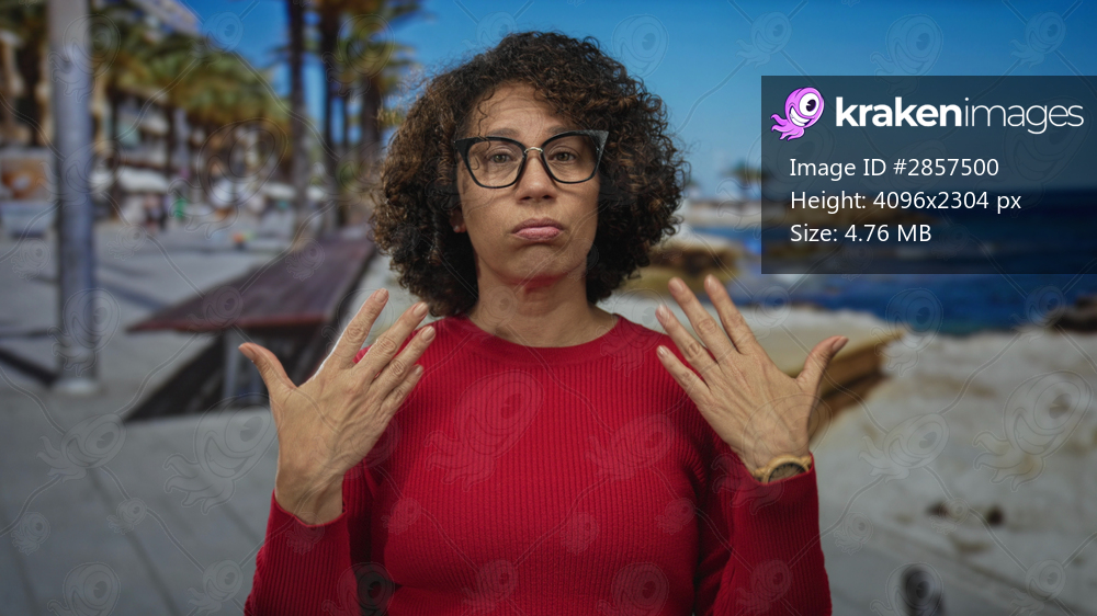 Woman fans neck with hands on a seaside promenade street, wearing red sweater and glasses while closing eyes; relief.