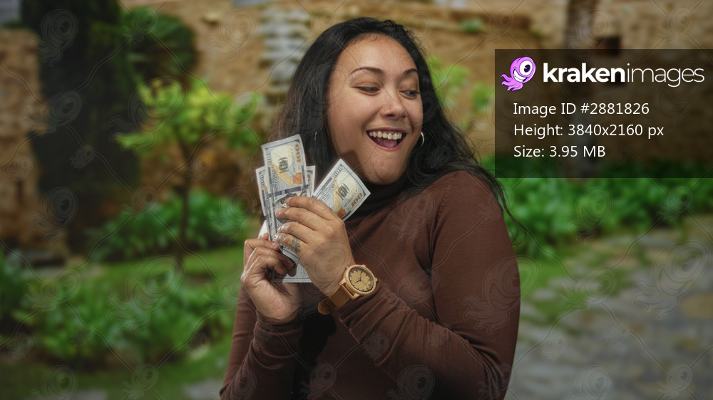 Woman fans us dollar bills with both hands on an old town stone street, smiling and holding cash close to chest while wearing brown turtleneck and wooden watch; celebratory joy. - Kraken Images