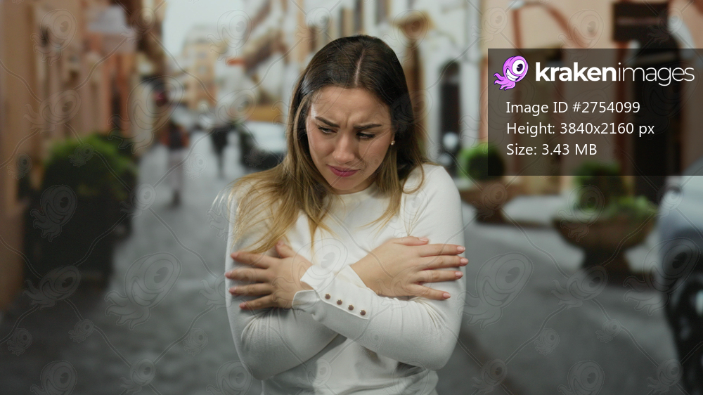 Woman feeling cold on a street with blurred urban background, wearing a white sweater, expressing discomfort with a visible shiver, capturing an outdoor winter experience. - Kraken Images