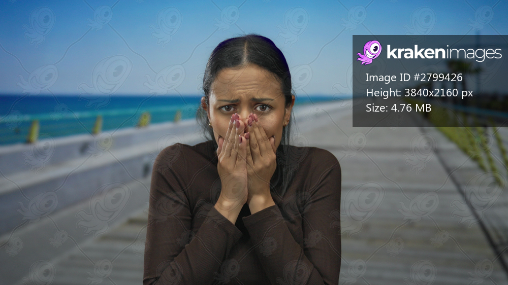 Woman feeling cold outdoors on a seaside promenade wearing a brown sweater looking chilly under the bright blue sky at an urban waterfront setting.