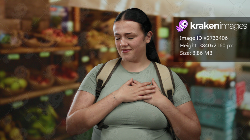 Woman feeling discomfort at an outdoor fruit market, highlighting the colorful produce and vibrant setting, while wearing a backpack and casual attire, depicting urban exploration. - Kraken Images