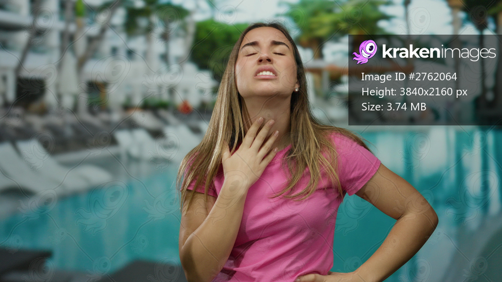 Woman feeling discomfort holding throat by a poolside at a luxurious resort hotel, wearing a pink shirt, depicting a theme of health and wellness outdoors. - Kraken Images