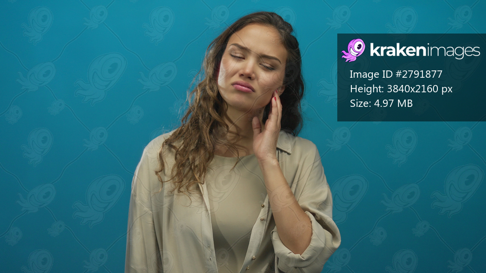 Woman feeling discomfort touching her cheek isolated against a solid blue background wearing casual attire with a neutral expression conveying distress and discomfort. - Kraken Images