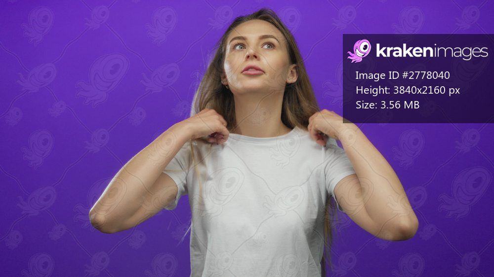 Woman feeling hot over isolated purple background, expressing discomfort with gestures and facial expressions, wearing casual white shirt.
