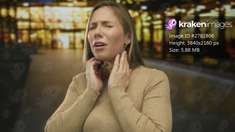 Woman feeling pain outdoors at night in city setting with urban lights, touching her throat while appearing distressed, wearing a beige sweater, blonde hair, expression of discomfort. - Kraken Images