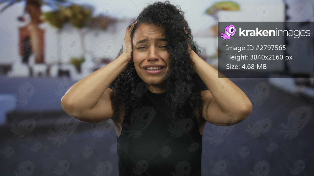Woman feeling stressed on a sunny outdoor street, holding head in hands, young hispanic female expressing frustration in latin urban background.
