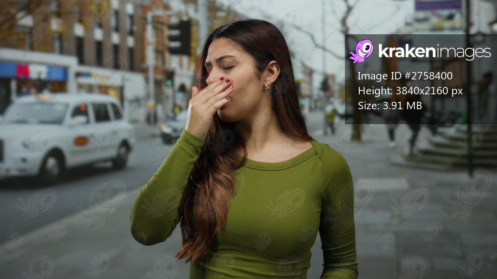 Woman feeling unwell outdoors with a headache on a bustling city street wearing casual green, showcasing urban lifestyle and diverse cityscape.