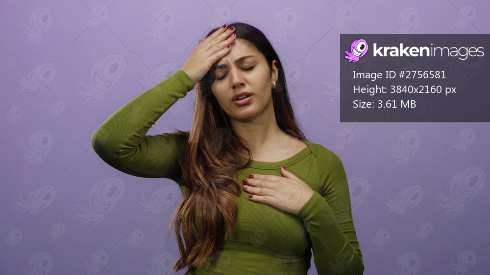 Woman feeling unwell sneezes while standing against a purple background with a pained expression, wearing a green top, depicting illness and discomfort indoors. - Kraken Images