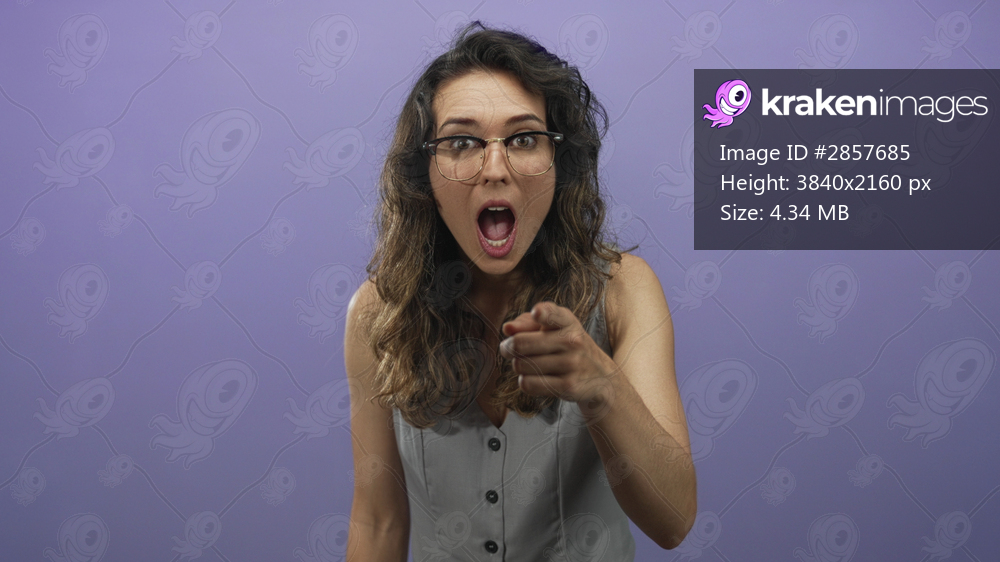 Woman finger pointing at camera in purple studio wearing glasses and tanktop with open mouth expression; surprise.
