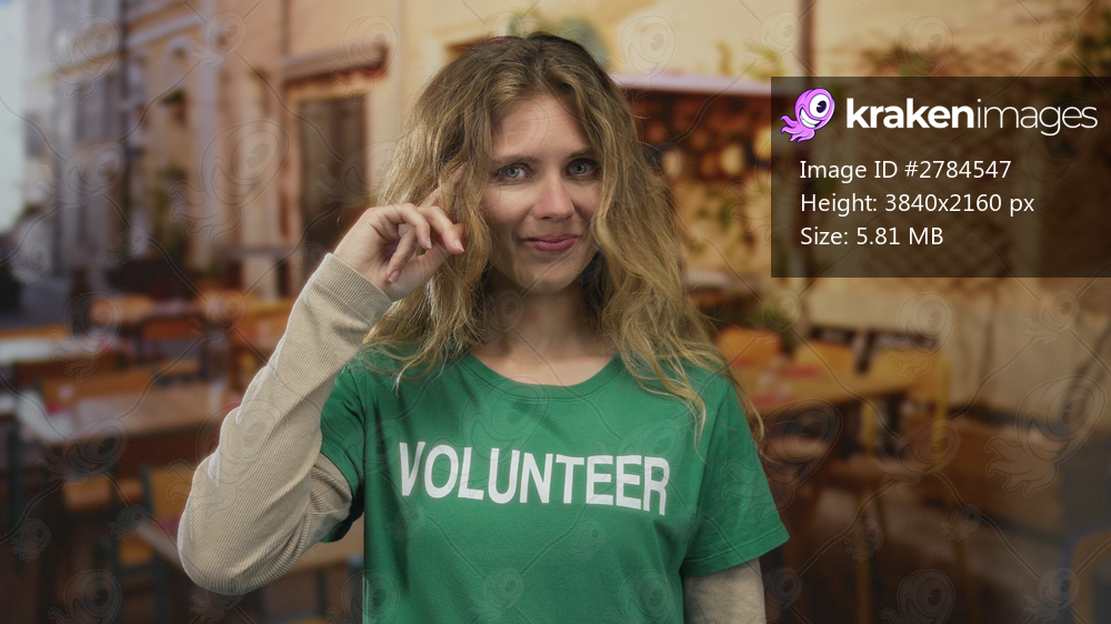 Woman finger pointing cafe blonde young crazy head volunteer gesture captured in candid footage conveys playful absurdity.