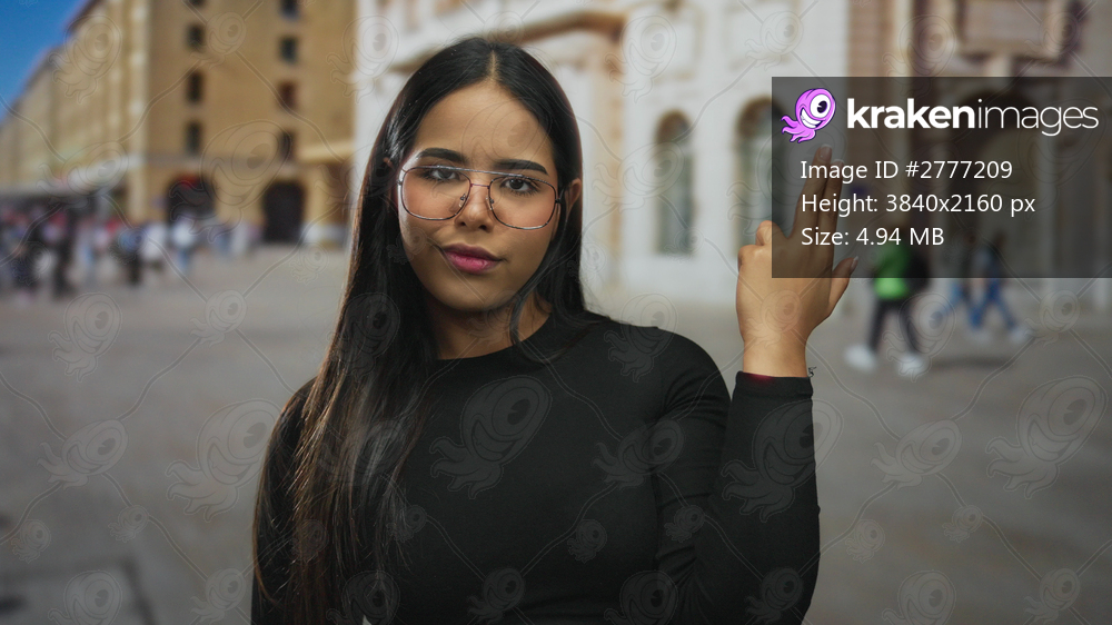Woman finger pointing street backdrop with young latin hispanic vibe looks outdoors annoyed bored expression.