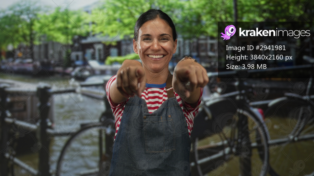 Woman with finger pointing to camera on street in amsterdam wearing striped shirt and denim apron; playful invitation.