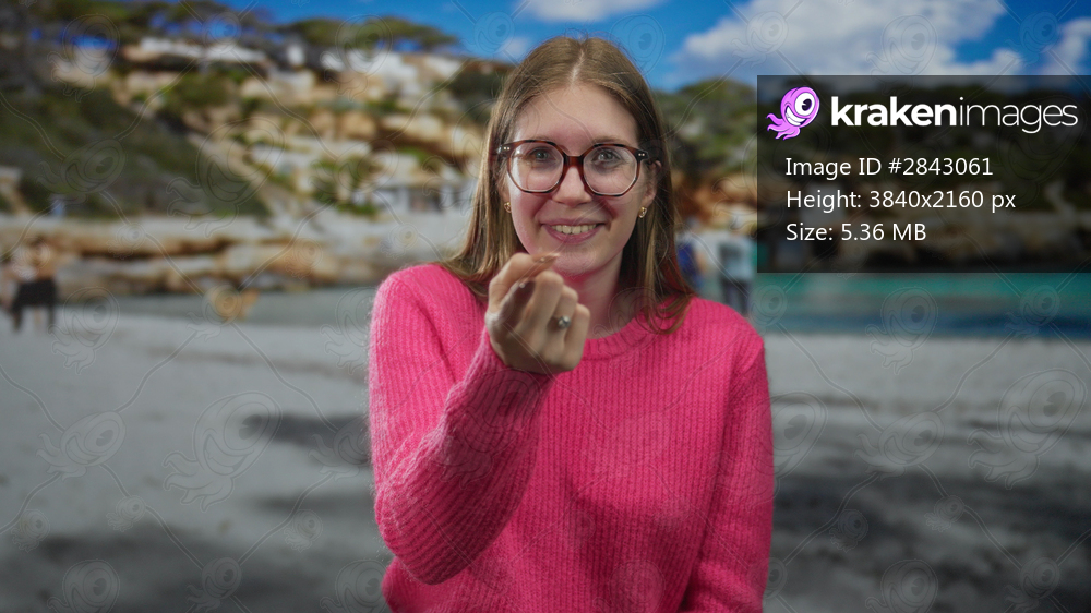 Woman finger pointing to camera on sunlit sandy beach shore; enthusiasm invitation engagement inspiration.