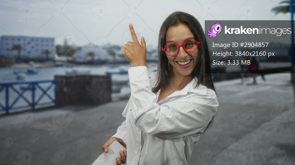 Woman finger pointing to object on seaside street while holding tablet and wearing red round glasses; cheerful curiosity.
