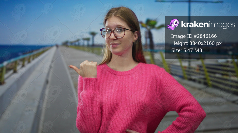 Woman finger pointing to object on street promenade by seaside in pink sweater with skeptical expression; doubt.
