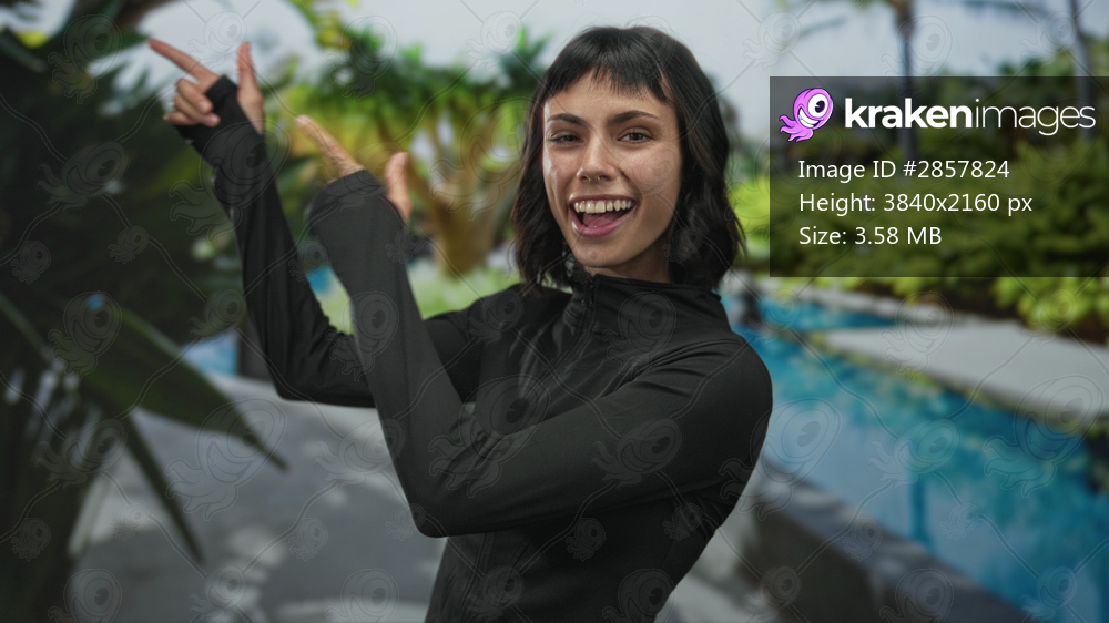Woman finger pointing to pool at resort while wearing black athletic jacket and smiling under bright sunlight; happiness.