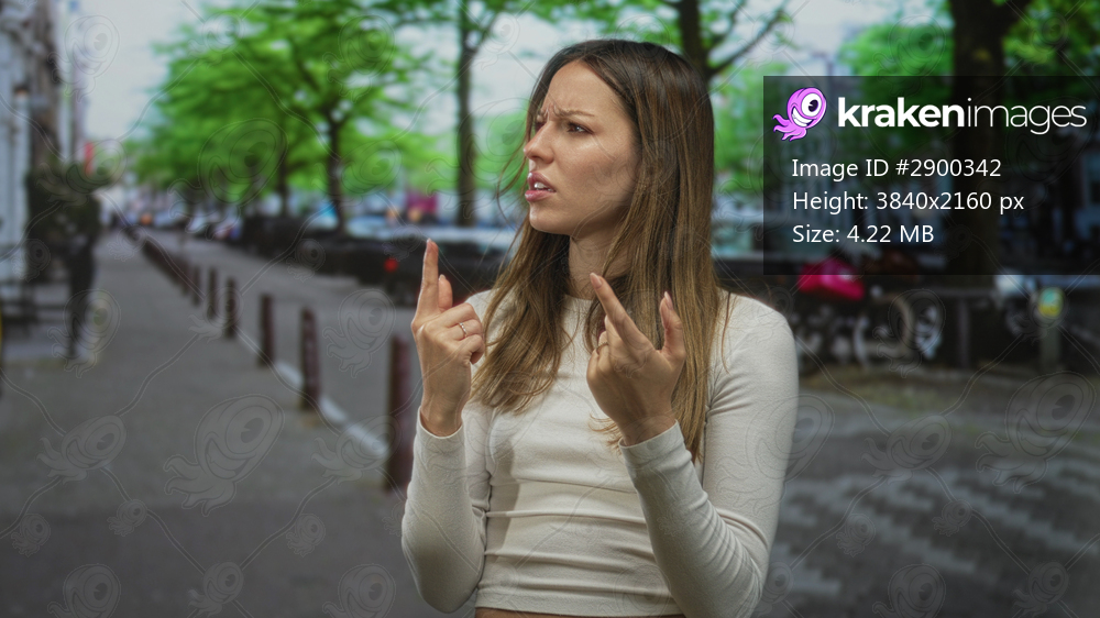 Woman finger pointing to side on a city street with raised hands and tense expression, squinting brow and pursed lips; confusion doubt.