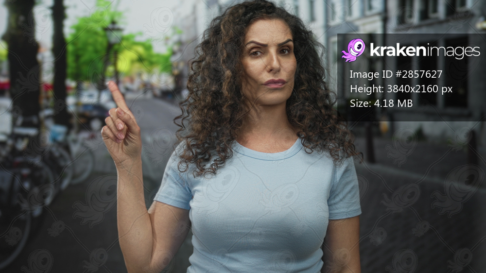 Woman with finger pointing to street building facade past blurry bicycles in city scene; determination.