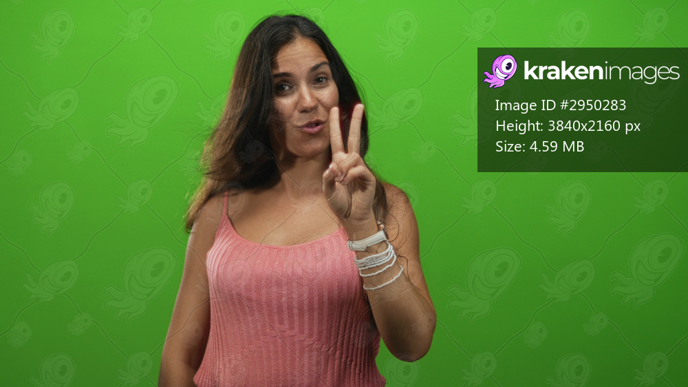 Woman finger pointing up wearing bracelets and pink tank top in green studio; playful confidence invitation.