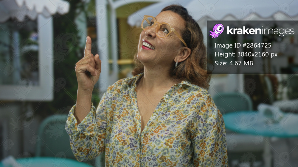 Woman with finger pointing upward on street terrace wearing floral blouse and glasses, smiling broadly; hope.