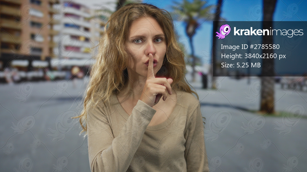 Woman finger shushing boulevard blonde young lips gesture outdoor sunny setting evokes secrecy.