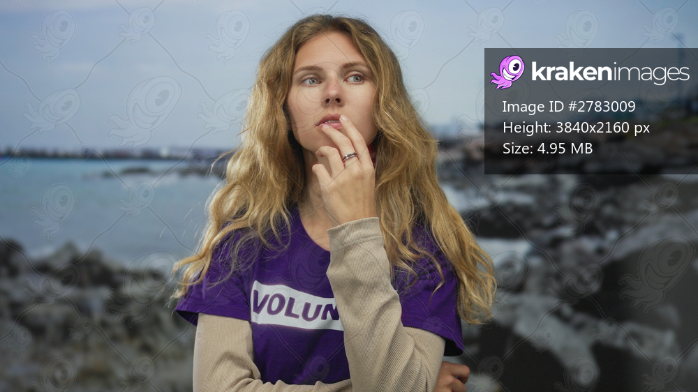 Woman finger thinking beach blonde young volunteer sea shore rocky scene shows thoughtful expression.