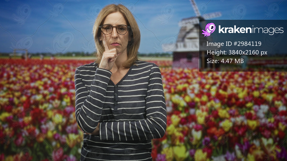 Woman with finger to cheek and crossed arms, wearing glasses and striped shirt, standing in studio with tulip field and windmill; contemplation doubt.