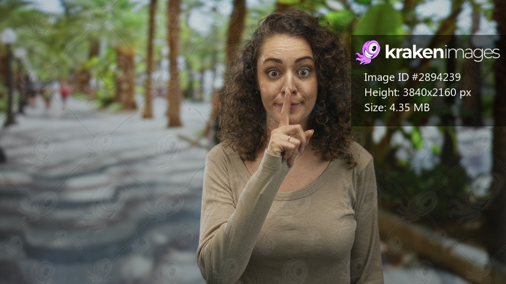 Woman finger to chest on a street with palm trees, gazing sideways with a small smile; hesitation reservation.