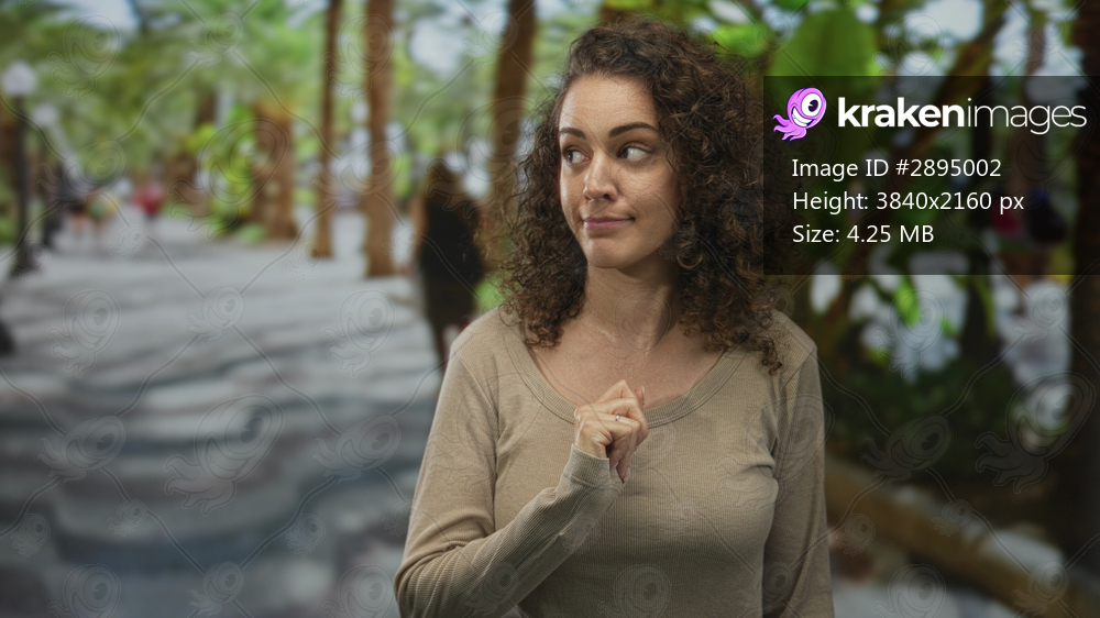 Woman finger to chest on a street with palm trees, gazing sideways with a small smile; hesitation reservation.