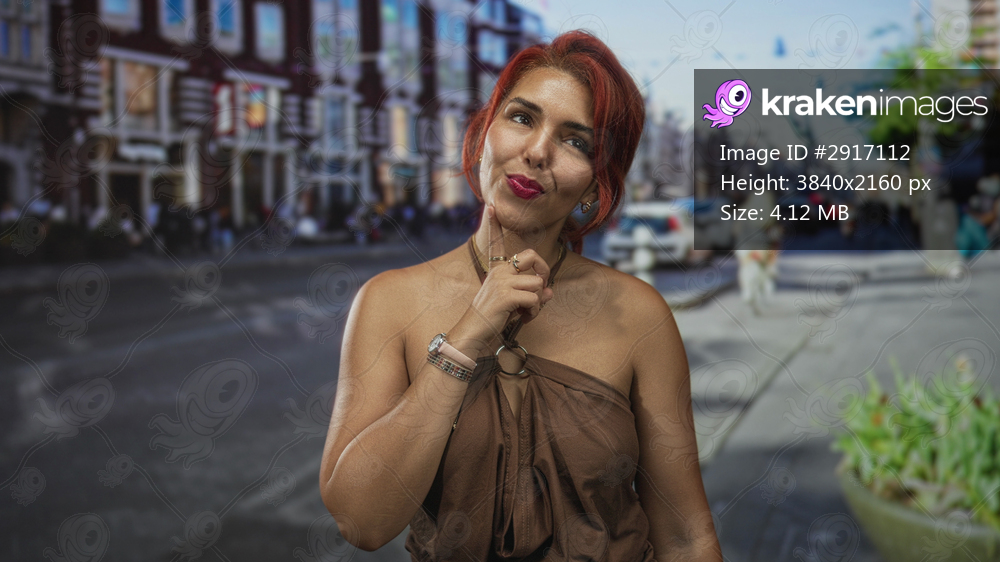 Woman finger to chin on busy city street with cars and planters nearby, wearing brown top; thoughtful curiosity.