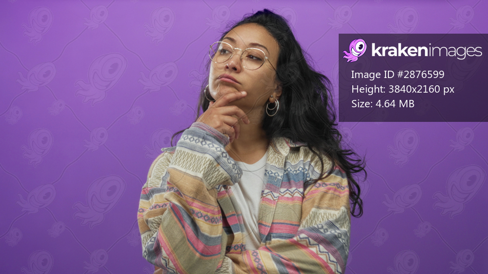 Woman finger to chin, wearing glasses and hoop earrings against a purple studio wall; thinking reflection.
