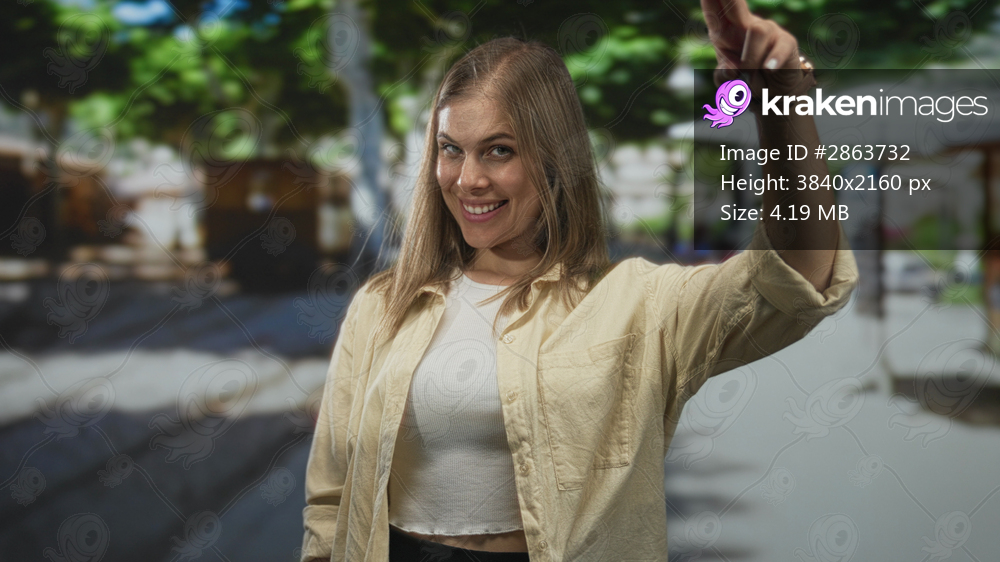 Woman finger to forehead for salute on sunlit city street walkway with blurred green trees and market stalls behind; pride.