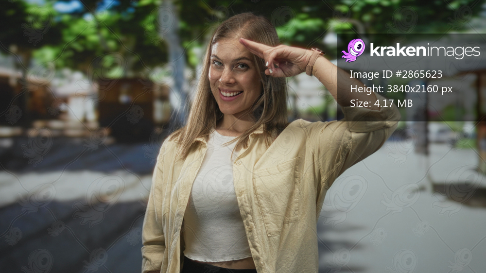 Woman finger to forehead for salute on sunlit city street walkway with blurred green trees and market stalls behind; pride.