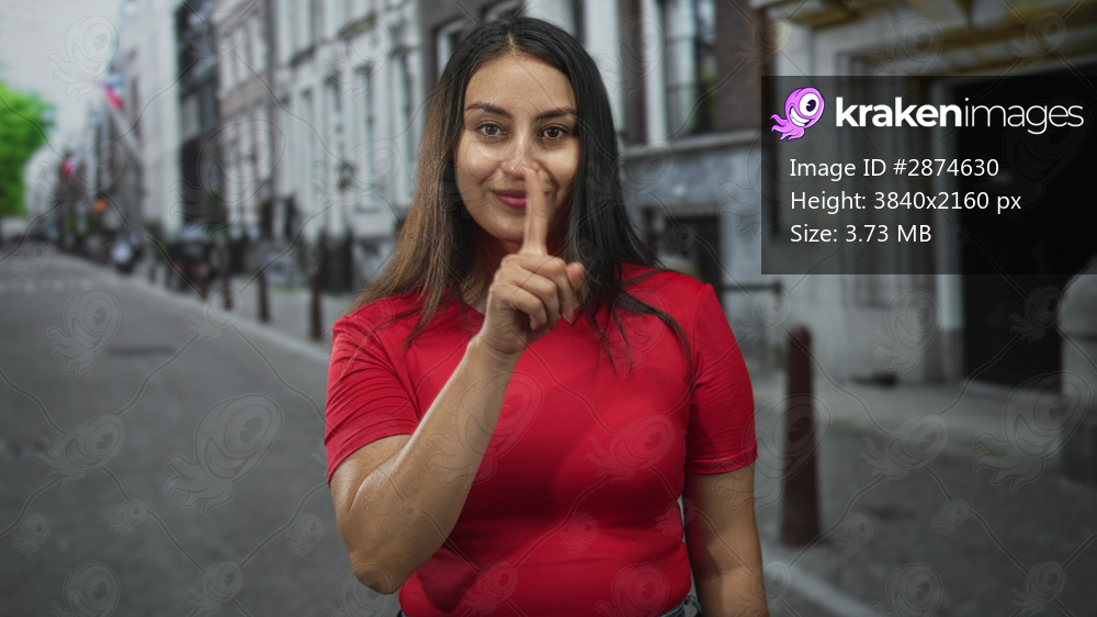 Woman finger to lips covering mouth on street wearing red shirt near building entrance and bollard by sidewalk; secret quiet moment.