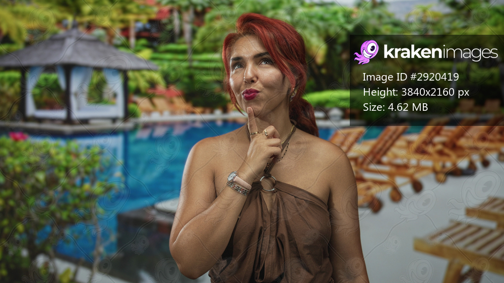 Woman with finger to lips for silence at a resort pool, bare shoulders and rings visible, wearing brown strapless wrap; playful secret vacation.