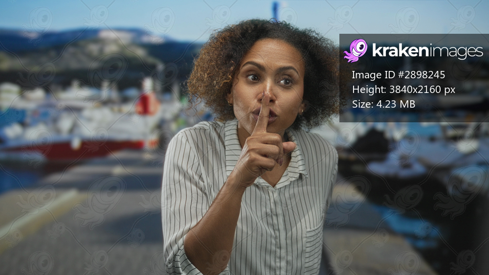 Woman with finger to lips for silence at a seaside port pier, leaning forward in a shushing gesture; silence secrecy serious.