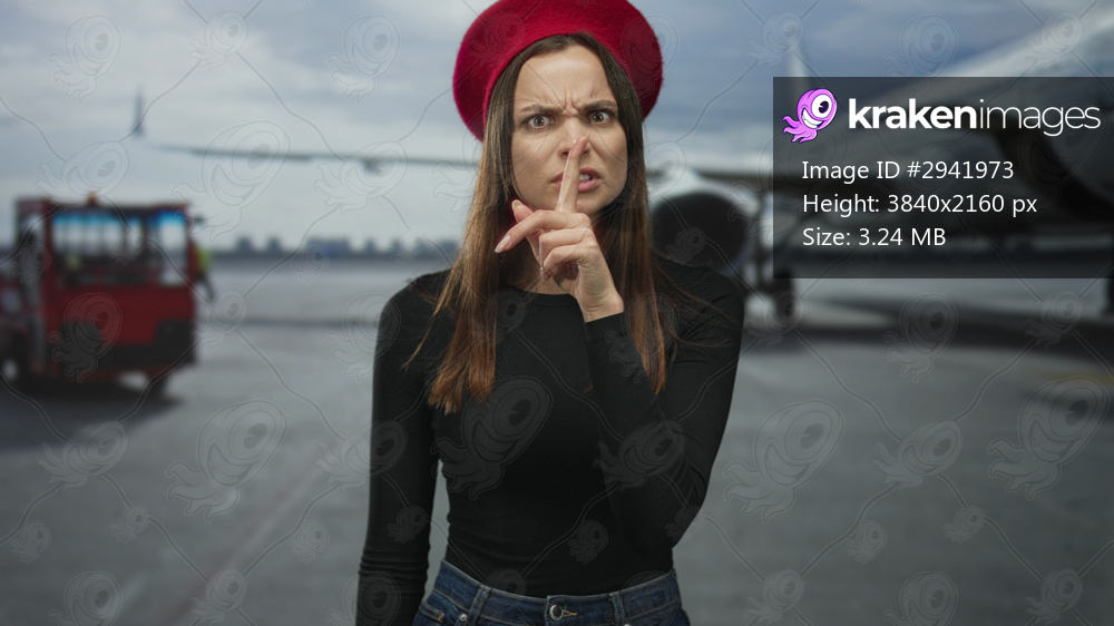 Woman finger to lips for silence at airport tarmac with plane and baggage cart behind her; quiet warning.
