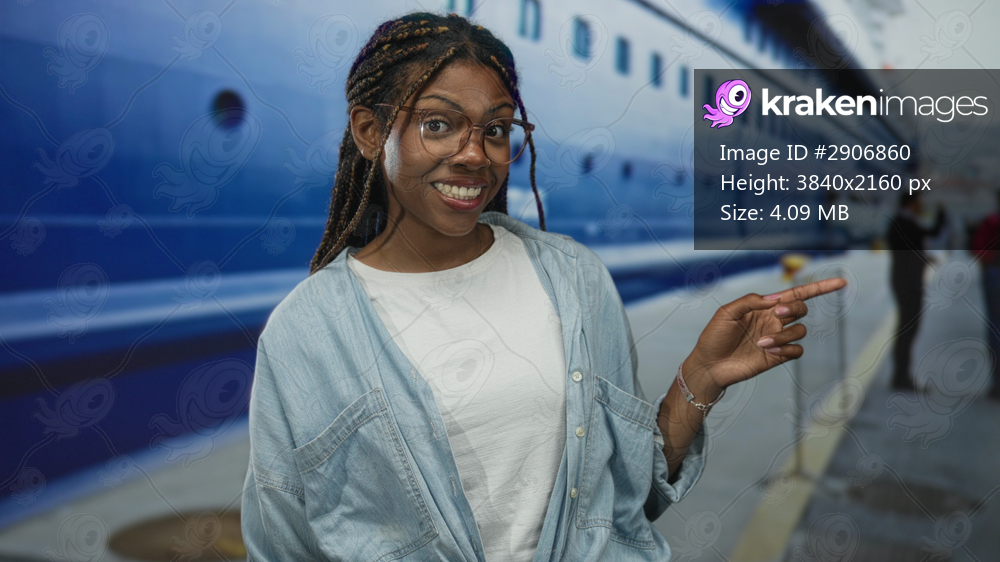 Woman finger to lips for silence by a cruise ship at building dockside, wearing white tshirt and denim shirt; playful secrecy.