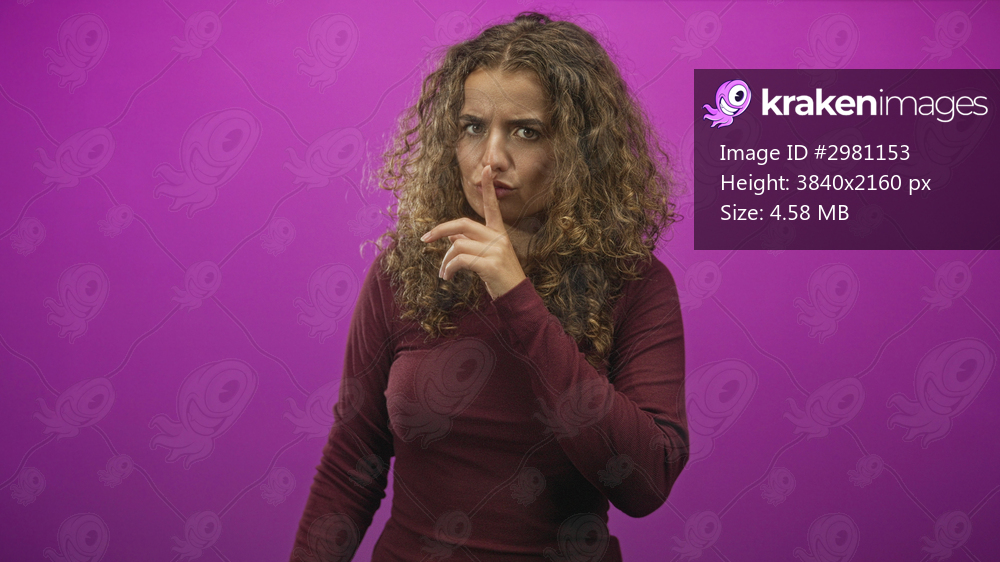 Woman finger to lips for silence, curly hair visible, wearing maroon sweater, standing against a purple studio backdrop; quiet secrecy.
