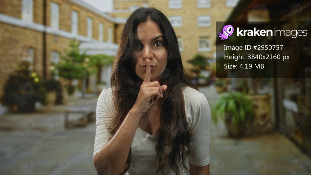 Woman finger to lips for silence in building courtyard with long hair and direct stare; silence restraint.