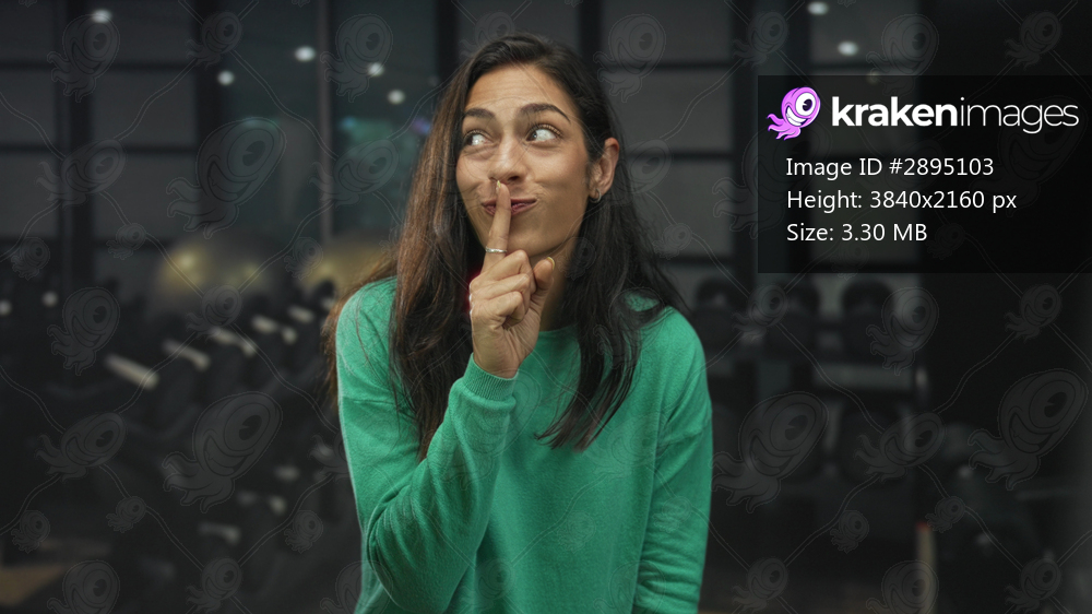 Woman finger to lips for silence in gym with dumbbells and kettlebells visible wearing green sweater facing camera; secret silence.