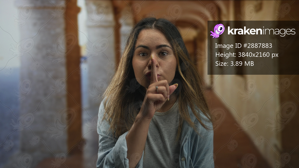 Woman finger to lips for silence in old town building corridor wearing denim shirt and casual top; silence secret mystery.