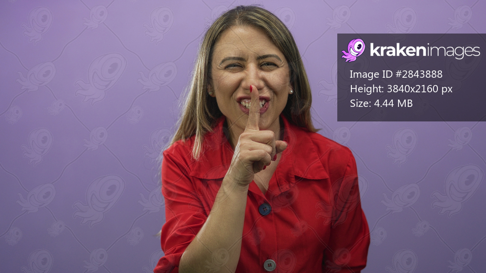 Woman finger to lips for silence in purple studio wearing red blouse and smiling softly; calm secrecy.