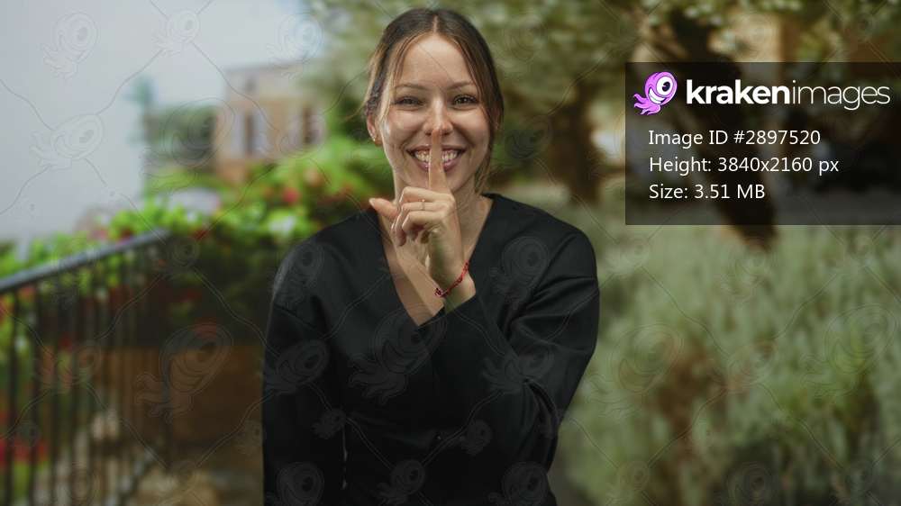 Woman with finger to lips for silence in sunlit park by green railing and trees, smiling softly; playful secrecy.