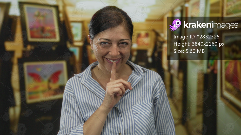 Woman finger to lips for silence inside modern art gallery building with multiple framed paintings; hush.