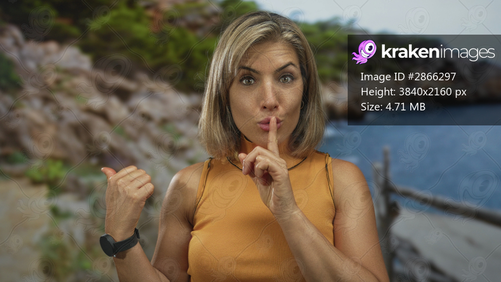 Woman finger to lips for silence on a rocky coast with wooden railing and wristwatch; quiet secrecy.