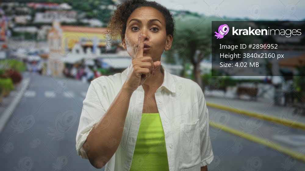 Woman with finger to lips for silence on a street in a coastal town wearing white shirt and neon top, facing camera; quiet secrecy.