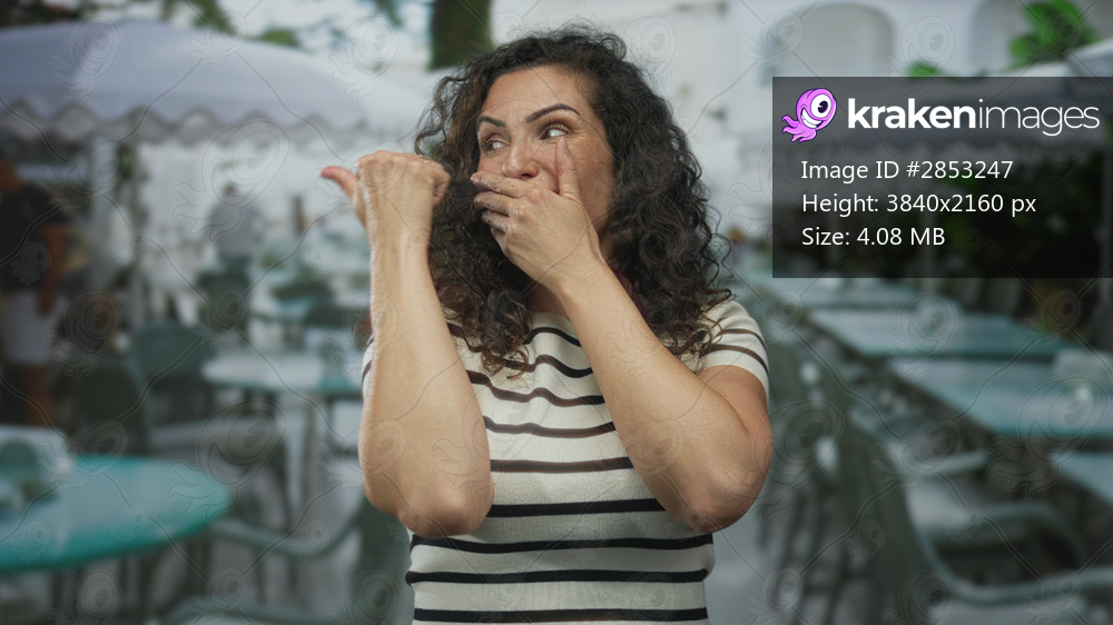 Woman finger to lips for silence on a sunny restaurant terrace pointing thumb toward empty tables and chairs; silence secrecy surprise caution.