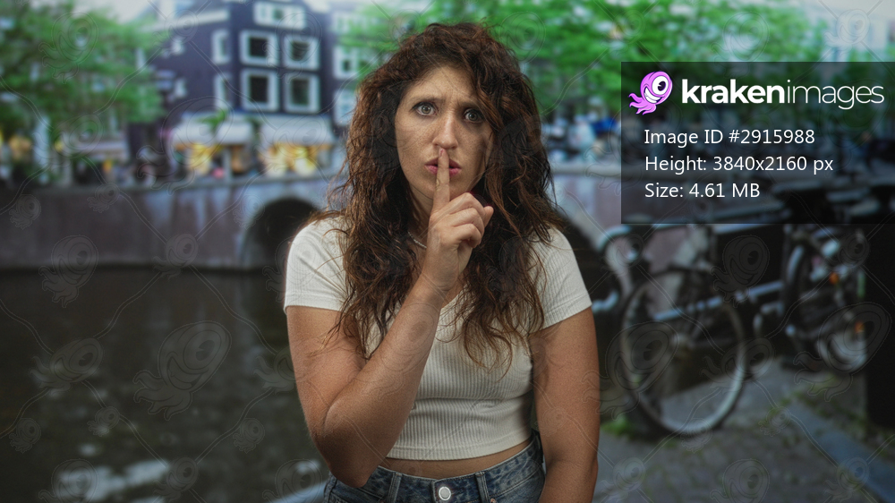 Woman with finger to lips for silence on amsterdam street by canal and parked bicycle; quiet secrecy.