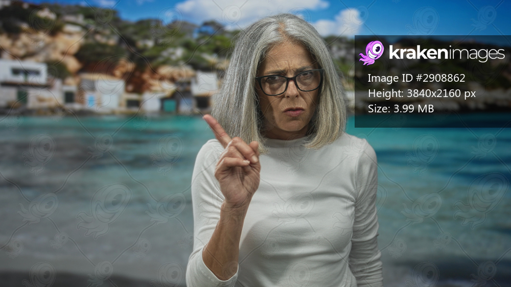 Woman finger to lips for silence on beach with grey hair and eyeglasses near seaside houses, white shirt visible; serious warning.